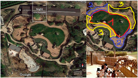 The giraffes’ enclosure: on the left—aerial view with the night enclosure in the grey rectangle; on the right, top—the zones used for space use analysis; on the right, bottom: a picture of an actual interaction.
