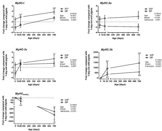 Age- and breed-dependent changes in MyHC isoform expression in the longissimus dorsi muscle of wild pigs (WPs) and domestic pigs (DPs). Shown are the mean fold changes with upper and lower limits in MyHCs expression for WPs and DPs compared with the expression in 1-day-old wild piglets. A fold-change value less than 1 was replaced by a negative inverse of the original fold-change value. Upper and lower limits were calculated for each fold-change value using the standard error of the mean. Effect (p-values) for age, breed, and their combined effect (age × breed interaction) were derived by two-way analysis of variance. Differences were considered significant at p < 0.05 (Tukey’s multiple comparisons tests). a-significantly different between breeds within an age group; b1-significantly different between 1-day-old wild piglets and 3-week-old pigs; b2-significantly different between 1-day-old wild piglets and 2-year-old pigs.