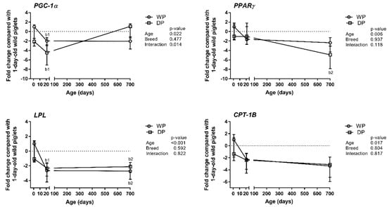Age- and breed-dependent changes in lipid metabolism-related gene (PGC-1α, PPARγ, LPL, and CPT-1B) expression in the longissimus dorsi muscle of wild pigs (WPs) and domestic pigs (DPs). Shown are the mean fold changes with upper and lower limits in lipid metabolism-related genes expression for WPs and DPs compared with the expression in 1-day-old wild piglets. A fold-change value less than 1 was replaced by a negative inverse of the original fold-change value. Upper and lower limits were calculated for each fold-change value using the standard error of the mean. Effect (p-Values) for age, breed, and their combined effect (age × breed interaction) were derived by two-way analysis of variance. Differences were considered significant at p < 0.05 (Tukey’s multiple comparisons tests). a-significantly different between breeds within an age group; b1-significantly different between 1-day-old wild piglets and 3-week-old pigs; b2-significantly different between 1-day-old wild piglets and 2-year-old pigs.