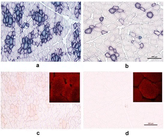We performed enzyme histochemistry assays for SDH activity and oil red O staining (Figure 3). The results revealed that SDH-positive myofibers were more numerous in the adult WPs than in the adult DPs. In the WPs, the myofibers exhibiting the most SDH activity largely overlapped with those that were most intensely stained with oil red O, which indicated IMFL accumulation (cf. panels a and c). In the DPs, the oil red O staining was very faint; however, we were able to show that IMFLs were present in individual myofibers in the DPs using confocal microscopy (inserts in Figure 3c,d).