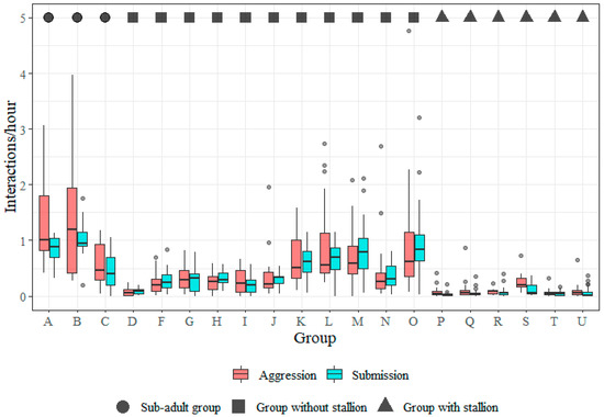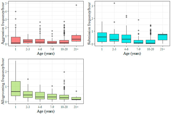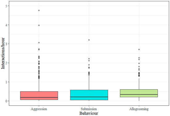 Boxplots showing the distribution of individual social interaction frequencies (per hour) for aggression, submission and allogrooming. Data from 426 horses are displayed. Medians for aggression and submission were 0.18/h and 0.20/h, respectively, and the corresponding averages were 0.42/h (standard error (SE) = 0.032) and 0.35/h (SE = 0.020). The median frequency of allogrooming across groups was 0.33/h and the mean was 0.43/h (SE = 0.018). The aggression frequency from one outlier was excluded (see Section 2.4).