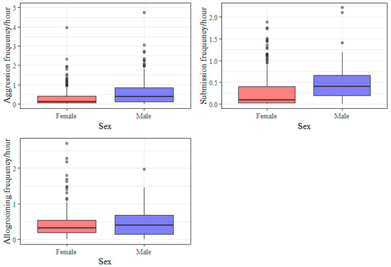 Boxplots showing the distribution of individual social interaction frequencies (per hour) for aggression, submission and allogrooming by sex. Data from 297 female horses and 129 male horses (118 geldings, six stallions, five colts) are displayed. Median aggression rate for the stallions was 0.54 (IQR = 0.36). Median submission rate was 0.20 (IQR = 0.11). Median allogrooming rate was 0.20 (IQR = 0.20). The aggression frequency from one outlier was excluded (see Section 2.4).