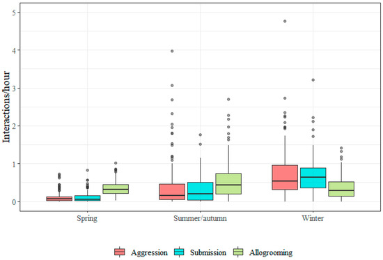 Boxplots showing the distribution of individual social interaction frequencies (per hour) for aggression, submission and allogrooming by season. Data from 20 horses observed in autumn, 144 in spring, 137 in summer, and 125 in winter are displayed. Only one group was observed in autumn and their data are combined with the data from the summer groups. The aggression frequency from one outlier was excluded (see Section 2.4).