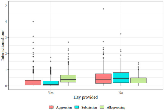 Boxplots showing the distribution of individual social interaction frequencies (per hour) for aggression, submission and allogrooming by provision of hay. Data from 176 horses receiving hay and 250 not receiving hay is displayed. The aggression frequency from one outlier was excluded (see Section 2.4).