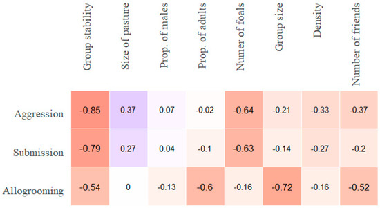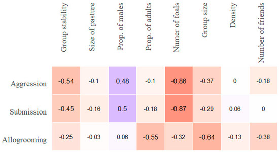 Spearman rank-order correlations (rho) of all group-level variables with group median individual aggression, submission and allogrooming frequencies (per hour) for the 14 non-stallion groups. The colour coding is employed to facilitate the visualization of the strength of correlations. “Number of friends” refers to the median number of friends (allogrooming associates) in the group.