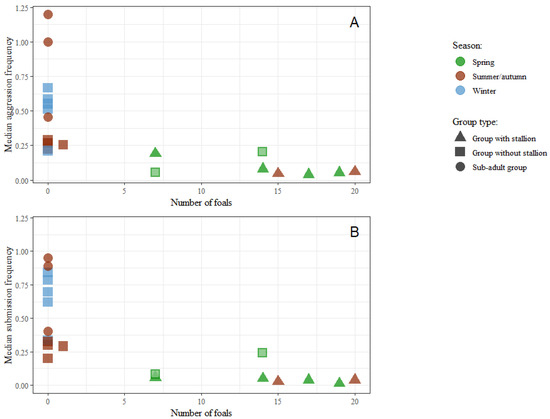 Scatterplots of group medians for both individual aggression (A) and individual submission (B) frequencies by number of foals in a group. All groups observed in winter were provided with hay. Two groups observed in spring were also provided with hay and are marked with a light centre.