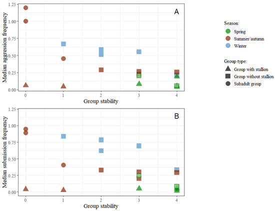 Scatterplots of group medians for both individual aggression (A) and submission (B) frequencies by stability of the groups (defined in Table 3). All groups observed in winter were provided with hay. Two groups observed in spring were also provided with hay and are marked with a light centre.