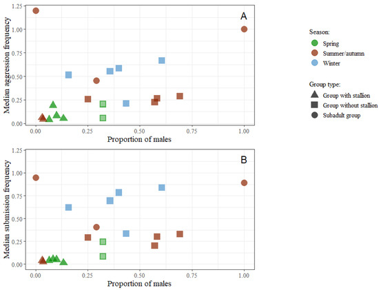 The dataset consists of observations of individual horses clustered in groups. The groups were selected as examples of groups of certain types (breeding groups with a stallion, mixed groups without a stallion, sub-adult groups) and under certain conditions (e.g., season) for various prior research projects (see Table 1). The response variables are measures of the behaviour types aggression, submission and allogrooming. For data at the individual level, as well as the effects of season and group type, the bivariate relationship between behaviour frequencies, i.e., per hour per horse and individual characteristics is presented. For group level data, the relationship between median behaviour frequencies in the group and group variables (Table 3) is presented. As the distributions of behaviour frequencies are highly positively skewed, we always present the median as a measure of central tendency and all correlation coefficients presented are Spearman rank-order correlation coefficients. All statistical analyses were conducted using R 3.4.4 [41].