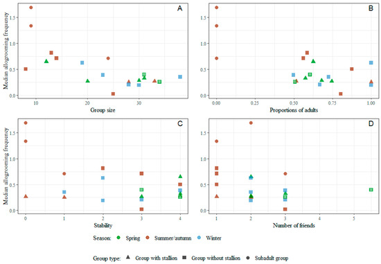 Scatterplots of group median individual allogrooming frequency (per hour) by group size (A), proportion of adults (B), stability (C) and median number of friends (preferred partners) (D). All groups observed in winter were provided with hay. Two groups observed in spring were also provided with hay and are marked with a light centre. “Number of friends” refers to the median number of friends (allogrooming associates) in the group.