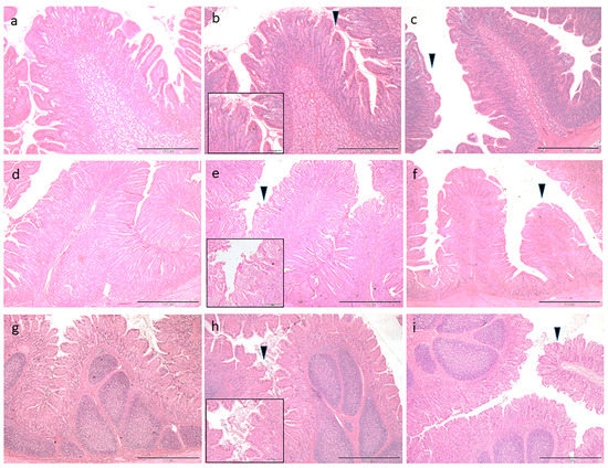 Histological findings of sections of the small intestine (hematoxylin eosin staining) in each group: (a) duodenum, control group (CTR); (b) duodenum, diet with 9% sunflower oil (T1); (c) duodenum, T1 supplemented with 5 mg of verbascoside/kg feed (T2); (d) jejunum, CTR; (e) jejunum, T1; (f) jejunum, T2, (g) ileum, CTR; (h) ileum, T1; and (i) ileum, T2. The arrowheads indicate erosion of the tips of the villi. The insert is an enlargement of the arrow zone, showing epithelial cells debris and the irregular profile of the villi.