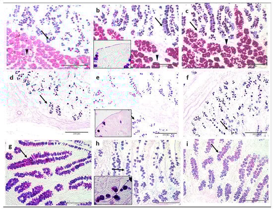 Histochemical findings of sections of the small intestine (Alcian blue 8GX, pH 2.5-periodic acid-Schiff combination (AB-PAS) staining) in each group: (a) duodenum, CTR; (b) duodenum, T1; (c) duodenum, T2; (d) jejunum, CTR; (e) jejunum, T1; (f) jejunum, T2, (g) ileum, CTR; (h) ileum, T1; and (i) ileum, T2. The arrows indicate intestinal goblet cells; the arrowheads indicate Brunner’s glands; the blue color indicates acidic mucins; and the pink color indicates neutral mucins. The inserts (b,e,h) are representative images at a high magnification (100 ×) of the mucosal layer.