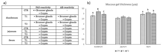 (a). Qualitative evaluation of the neutral and/or acidic glyconjugates; (b) the histometrical findings of the mucus gel thickness in the duodenum, jejunum and ileum of CTR, T1 and T2 animals (CTR—control diet; T1—sunflower oil supplemented diet; T2—sunflower oil supplemented diet plus verbascoside). The values are shown with different superscripts (a, b) for p < 0.05 and (A, B) for p < 0.01.