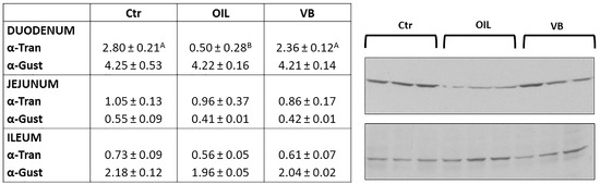 Western blot findings of α-tran and α-gust in the small intestine of CTR, T1 and T2 animals. The values are shown with different superscripts (A, B) for p < 0.01.