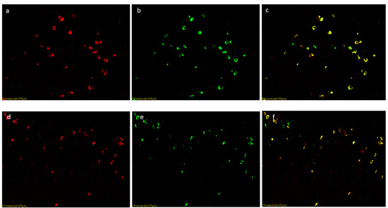 α-tran immunoreactive cells (Figure 5a,d respectively, red color) and chromogranin A or ghrelin immunopositive cells (Figure 5b,e respectively, green color) were detected and co-expressions with both chromogranin A or ghrelin were observed in endocrine cells (Figure 5c,f respectively, yellow color). Cellular counts revealed that the percentage of α-tran/chromoA-IR cells was significantly higher in CTR vs. T1 vs. T2 groups (p < 0.01, all comparisons Figure 6); moreover, α-tran/ghre IR-cells were significantly different in CTR/T2 vs. T1 (p < 0.01) and CTR vs. T2 (p < 0.05).