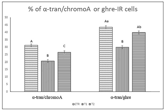 Percentage of α-tran/chromoA or ghre-IR cells. The values are shown with different superscripts (a, b) for p < 0.05 and (A, B) for p < 0.01.