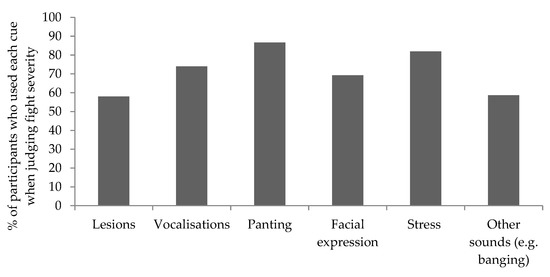 There were significant main effects of occupation on emotional response and judgment of exhaustion across video clips (Table 7). Pairwise comparisons revealed that farmers and animal science students expressed greater emotional response scores when compared to agricultural students (p < 0.05; Figure 1a). Farmers judged fight exhaustion to be higher than agricultural students (p < 0.01; Figure 1b). Occupations did not differ in their judgments of severity (p > 0.05) (Figure 1c). Participants employed a range of cues when judging severity (see Figure 2). There was no effect of occupation on use of skin lesions, vocalizations, panting, facial expressions or stress when judging the severity of aggressive encounters (p > 0.05). However, there was an effect of occupation on use of ‘other sounds (e.g., banging)’ (p < 0.01), with animal science students using this cue significantly more than farmers and agricultural students (p < 0.05).