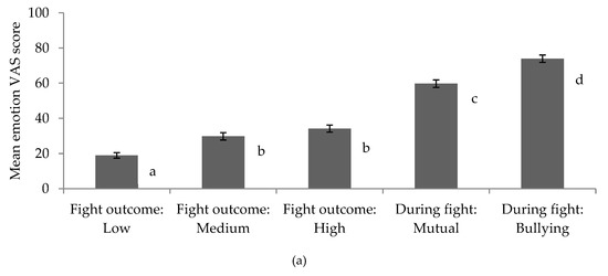 Statistical analyses were conducted in Statistical Package for the Social Sciences (SPSS, version 25, International Business Machines Corp., Armonk, NY, USA). Normality of the data was assessed by inspection of the residuals and data were transformed wherever necessary. Residual maximal likelihood (REML) models were run to investigate the factors that influence: (1) Emotional response; (2) Judgment of fight severity; (3) Judgment of exhaustion; and (4) Motivation to intervene if the interaction had occurred on their own farm. The fixed effects in the first three models were gender, age, occupation and the video clip. Occupation was not included as a fixed effect in the fourth model as only farmers were asked the question ‘If you saw this fight on your farm, how much would you want to prevent it continuing?’. The clip order was included in each model as a random effect. The main effects were removed if p > 0.1 and the model was re-run until the simplest model was achieved. Post hoc analyses were conducted using least significant difference (LSD) tests with a Bonferroni correction made for multiple comparisons. Six Chi Square tests were carried out to ascertain the effects of occupation on the cues used to judge fight severity. The dependent variables were the use of: (1) lesions; (2) vocalizations; (3) panting; (4) other sounds (e.g., banging); (5) facial expression and; (6) stress when judging fight severity. The results were considered statistically significant where p < 0.05.