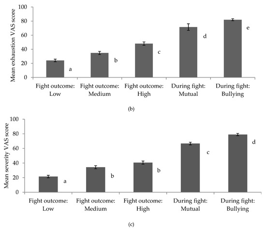 Mean visual analogue scale (VAS) score for (a) emotion, (b) exhaustion, and (c) severity according to video clip; whereby video clips with different letters express a significant difference in mean response.