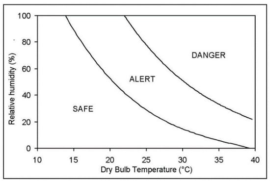 Thermal Comfort Zones for broiler transport defined by apparent equivalent temperature (AET) by Mitchell et al. []. Safe limit AET < 40 °C; danger limit Apparent equivalent temperature (AET) > 65 °C. Alert zone indicates moderate thermal stress with some degree of hyperthermia and acid-base disturbances; danger zone indicates severe thermal stress.