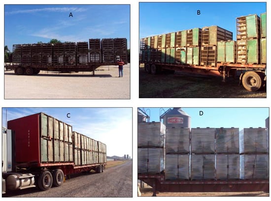 During the road transport, broilers were exposed to passive ventilation. Company live haul personnel used different management practices to mitigate seasonal impact on broilers. In mild and hot seasons, trailer modules were completely exposed to the weather (“Open”, Figure 2A). In extremely cold conditions, fiberglass panels were screwed onto the exterior sides of the modules to reduce wind (called Wind board). The size of the wind board was designed to leave gaps on all edges of the module so that air can penetrate through the wires. Wind boards were installed progressively, first to cover approximately half of the exterior area of sides on each module in the fall season (refers to “Single board”, Figure 2B), followed by covering about 90% of the area during the winter months (“Double board”, Figure 2C). Once boards were on, they became permanent for the season. The boards were uninstalled in reverse fashion in the spring. Under extremely cold conditions or when precipitation coincided with low temperatures, some companies wrapped double-board modules using thin plastic film (70 gauge, 50.6 cm wide) immediately after birds were loaded into a module (“Plastic wrap”, Figure 2D). This treatment was not fixed to the modules like the boards, allowing the integrator to select specific loads to apply the wrap to. The wrap was applied horizontally, leaving the solid top and bottom of the module uncovered by the wrap. The module was individually wrapped inside the broiler house before it was moved onto the trailer by a fork-lift. Special care was taken during the loading of the modules to avoid any edges of adjacent modules touching that could result in cuts in the wrap. Wrapping all modules for a trailer required an additional 30 min.