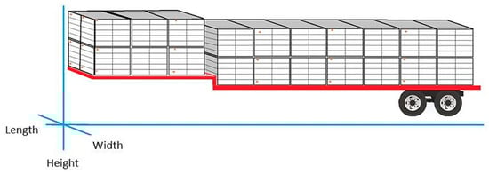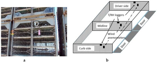 Temperature and relative humidity (RH) (Hobo U23 Pro v2, −40 °C to 70 °C, ± 0.2 °C, and 0 to 100%, ± 2.5%, Onset Computer Corporation, Bourne, MA, USA) were recorded continuously at 25 locations throughout the trailer with T recorded at additional 20 locations (DS1921L Thermochron, ± 0.5 °C, Maxim Integrated, Sunnyvale, CA, USA). Air speed were measured by six anemometers (Kestrel 4000; accuracy ± 0.1 m s−1 from 0.4 to 40 m s−1, Minneapolis, MN, USA) on two modules. Before each scheduled monitoring campaign, data loggers were installed at pre-determined module locations on empty trailers using cable ties at the processing plant (Figure 3a,b). Nine thermal loggers occupied each of the five vertical cross-sections (Figure 4). Temperature, humidity and wind were measured every 30 s. Times of departure from farm to the processing plant were recorded using a GPS unit (eTrex 20, Garmin, Olathe, KS, USA) that logged waypoints every second, downloaded after each trip.