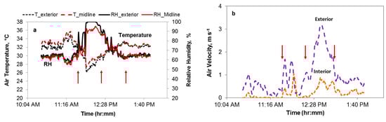 Figure 5 illustrates examples of the temperature, RH and air speed profiles of interior and exterior of a summer live-haul trip. The ambient temperature at the start of this transport was 30.6 °C (Figure 5a). The first arrow indicates the beginning of loading, the second the beginning of transport, and the third the arrival at the processing plant for holding period. Cooling, including convective fans and water sprays, was applied to the trailer during loading, resulting in a sharp temperature drop and relative humidity increase. Air speeds during the 40-min transport were variable (Figure 5b), likely in part determined by the speed of the vehicle. Air speeds at interior and exterior locations averaged 0.5 and 1.9 m s−1, respectively. Webster et al. [] reported mean air movement of open trucks in motion of 3.3 m s−1 (range 0.0 to 8.9 m s−1) of commercial broiler transporters in England. Weeks et al. [] calculated that air speeds in moving vehicles varied from 0.9 to 2.4 m s−1 with maxima of 6.0 m s−1.
