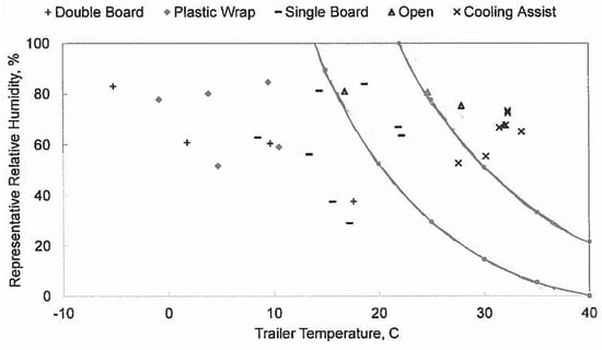 Average representative relative humidity vs. average trailer temperature of 28 monitored trips moving broilers to processing plants. The AET values corresponding to 40 and 65 °C [] were overlaid.