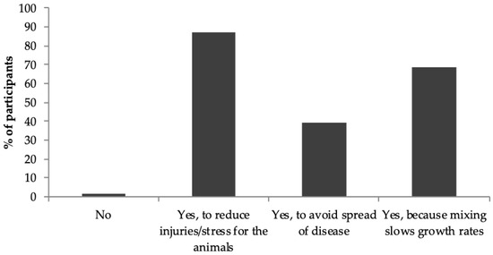 Almost all of the respondents (99.2%) reported avoiding mixing growing/finishing pigs wherever possible (see Figure 1). Nevertheless, only 5.7% of farmers reported never mixing unfamiliar growing/finishing pigs during production; 45.9% of farmers reported mixing once, 28.7% mix twice, 6.6% mix three times and one farmer mixed four times during each production cycle. Growing/finishing pigs were most commonly mixed at weaning (56.6%), followed by grower (28.7%), slaughter (23.8%) and finisher stages (16.4%). Nine percent of the farmers also indicated that they regroup pigs at other stages of production. Of those that specified the timing of this mixing, both reported regrouping the remaining pigs that were not yet big enough to be sent for slaughter (n = 2).