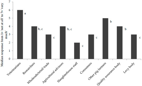 Farmers’ median response to the question: ‘How much does the opinion of this person/group affect your decisions with regard to mixing aggression?’ (from 1 = ‘not at all’, to 7 = ‘very much’). Letters indicate results of post-hoc pairwise comparisons whereby different letters indicate a significant difference between groups at p < 0.05.
