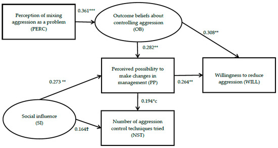 After a satisfactory measurement model was obtained, a structural model was estimated. The results can be seen in Figure 3. Latent variables are represented by ovals and observed variables are represented by rectangles in the path diagram. All possible relationships between observed and latent variables were estimated, and only relationships whereby p < 0.10 are displayed. All regression coefficients presented were positive. The regression coefficient revealed that OB was the largest determinant of WILL; furthermore OB affected WILL indirectly through PP. Therefore H1 (perceiving positive outcomes of controlling aggression has a positive influence on farmer willingness to control aggression) is supported. The regression coefficient of PP on WILL was also positive and significant. Therefore H2 (perceived possibility to control aggression has a positive influence on farmer willingness to control aggression) is also supported. The direct regression coefficient of SI on WILL was not significant; therefore H3 (valuing the opinion of relevant stakeholders regarding aggression has a positive influence on farmer willingness to control aggression) is not entirely supported. However, there was a significant indirect relationship between SI and WILL through PP. The direct regression coefficient of PERC on WILL was not significant; therefore H4 (Perceiving aggression as a problem on their farm has a positive influence on farmer willingness to control pig aggression) is not entirely supported. However, there was a significant indirect influence of PERC on WILL through OB. In addition, results revealed a significant, positive relationship between PP and NST. PERC and OB indirectly influenced NST through PP and the regression coefficient of SI on NST was also positive and approaching significance (p = 0.07). Spearman correlation matrix among variables used in the structural model can be seen in Appendix A.