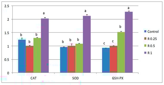 Effect of dietary rutin on the relative expression of CAT, SOD and GSH-PX in broiler livers. Each bar carrying different letters (a, b, c) was significantly different (p < 0.05) (mean ± standard error, n = 10).