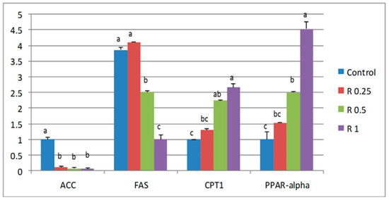 Effect of dietary rutin on the relative expression of ACC, FAS, CPT1, and PPAR-α in broiler livers. Each bar carrying different letters (a, b, c) was significantly different (p < 0.05) (mean ± standard error, n = 10).