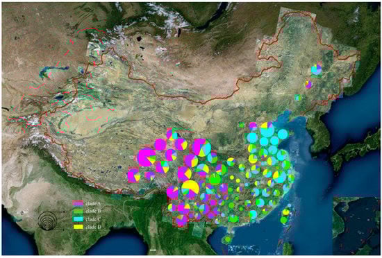 To predict the domestication area and expansion process of clades A, B, C, and D, we assigned each individual in these clades to a position on a map of China (Figure 2). We found an interesting phenomenon in which clade A was mainly distributed in the Qinghai-Tibet Plateau and there were two different directions of distribution: some individuals flowed to Qinghai and Gansu provinces and expanded to the northwest in China. The others expanded to Yunnan Province and other places in southwestern China. Clade B is mainly distributed in the southern Yangtze River area and expanded from Sichuan Province to the southeast of China. Clade C is mainly distributed in the middle and downstream regions of the Yangtze River in China and expanded from Zhejiang to Fujian Province. Clade D is mainly distributed upstream of the Yangtze River at the Hengduan Mountains at the junction of Gansu, Yunnan, and Sichuan Provinces.