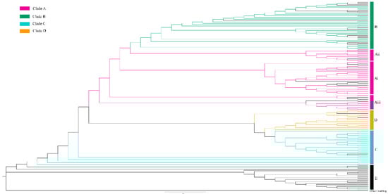 We reconstructed the phylogenetic tree of Chinese native pigs by using the mtDNA D-loop, the African warthog as the outgroup, and 60 published mtDNA sequences as a reference. We found results similar to those for the network. In the phylogenetic tree, the Chinese pig sequences mainly clustered into seven groups (Figure 3 and Supplementary Materials Figure S2). Clade A is divided into three groups (Ai, Aii, and Aiii), clade B clustered into the European group, and clades C and D, the remaining haplotypes, belong to a mixed group, making it difficult to accurately distinguish or locate them.