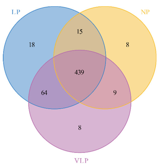 Venn diagram of shared operational taxonomic units (OTUs). The number of overlapping parts is the total number of OTUs among the groups, while the number of non-overlapping parts is the unique number of OTUs among the groups. NP = normal protein; LP = low-protein; VLP = very low-protein.