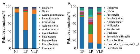 Taxonomic profiles of the gut bacteria in NP, LP, and VLP piglets from 16S rRNA gene sequencing. The relative abundance of the top 10 phylum (A) and the top 10 genus (B) of gut bacteria present in NP, LP and VLP piglets. NP = normal protein; LP = low-protein; VLP = very low-protein.