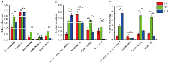 Kruskal-Wallis rank sum test analysis histogram. The bacterial phyla (A), genera (B), and qPCR (C) among NP, LP, and VLP. Bacterial taxa with mean relative abundance greater than 0.1% in least one group are included. Values are expressed as mean ± SE. The symbols represent significant difference among NP, LP, and VLP, ** p < 0.01, * p < 0.05, NP = normal protein; LP = low-protein; VLP = very low-protein.