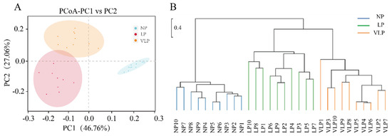 Principal component analysis using the weighted unifrac similarity method revealed that that PC1 and PC2 explained 46.76 and 27.06% of the variation between samples, respectively (Figure 4A). Furthermore, it was determined that the plots of different groups were distinctly separated. Consistent with the PCoA, the jackknifed beta diversity and hierarchical clustering analysis via the UPGMA demonstrated that different groups clustered into their own groups, as can be seen in Figure 4B. In addition, LP and VLP clustered into two subgroups based on PCoA (Figure 4A) and UPGMA (Figure 4B), which was attributed to individual variations of gut microbiome composition.