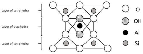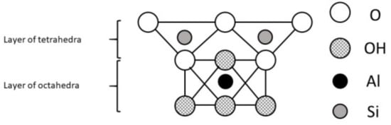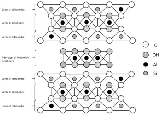 There is also an additional group of phyllosilicates, the 2:1:1 layer type, which have a basic 2:1 structure with an interlayer brucite (with cations Mg2+ or Fe2+) or gibbsite (with cation Al3+; Figure 3) sheet. This group is represented by chlorites. Since there is no water adsorption within the interlayer space, they are considered as nonexpansive minerals [11].