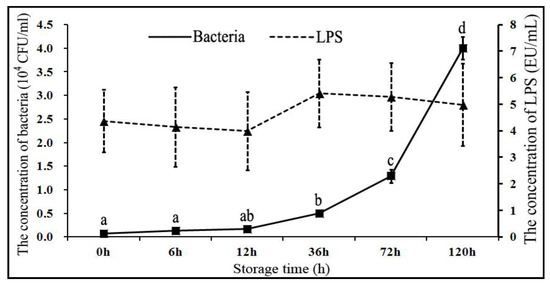 Changes in the concentration of bacterial colonies and lipopolysaccharide (LPS) in boar semen stored at 17 °C (liquid storage conditions). The values are presented as mean ± SE (n = 5 pooled samples). a, b, c, d indicate significant differences (p < 0.05).