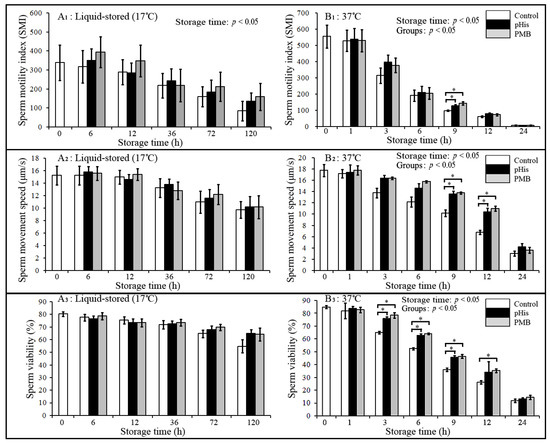 Changes in the sperm motility index, movement speed, and viability during liquid storage and at 37 °C incubation. * indicates a significant difference between the groups (p < 0.05). Panels A1, A2, and A3 depict the changes in sperm motility, movement speed, and viability, respectively, in liquid-stored (17 °C) boar semen; whereas panels B1, B2, and B3 depict changes in sperm motility, movement speed, and viability, respectively, in boar semen incubated at 37 °C. Boar sperm were diluted with BTS extender in the control group, and 100 μg/mL PMB or pHis was added to the BTS extender in PMB or pHis-treated groups. The changes in the sperm motility, movement, and viability were correlated with storage time extension in 37 °C incubation groups.