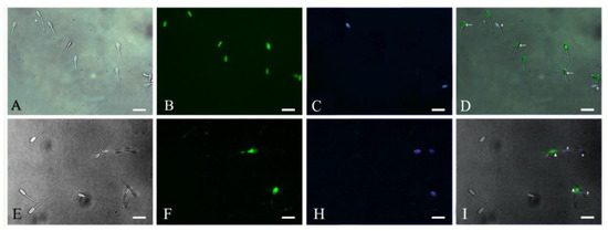 Early apoptosis of sperm was examined using an Annexin V-FITC Apoptosis Kit (ApoAlert® Annexin V-FITC Apoptosis Kit, KeyGen BioTech, Wuhan, China) as per the manufacturer’s instructions. Briefly, 5 × 106 sperm were resuspended in 500 μL of binding buffer (ready to use) and mixed with 5 μL Annexin V–FITC and 5 μL PI, and then the mixture was incubated at room temperature for 15 min in darkness. Fluorescence staining of sperm was monitored by fluorescence microscopy (Nikon 90i, Tokyo, Japan). Apoptotic sperm were recognized, and the early apoptosis rate was calculated using Image Pro Plus 6.0 software (Media Cybernetics, MD, USA) according to the following formula: Apoptosis percentage = [35].