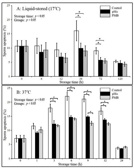 Changes in sperm apoptosis during liquid storage (17 °C) and at 37 °C incubation. * indicates a significant difference (p < 0.05). Boar sperm were diluted with BTS extender in the control group, and 100 μg/mL PMB or pHis was added in the BTS extender in PMB or pHis groups.
