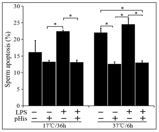 In the next phase of the experiment, we assessed the effect of pHis pre-treatment on LPS-induced boar sperm apoptosis. The boar sperm was treated with LPS alone or co-treated with LPS and pHis (pre-treatment). It was stored at 17 °C for 36 h or at 37 °C for 6 h, and the rate of sperm apoptosis was examined (Figure 5). The results showed that LPS, when incubated alone, significantly (p < 0.05) induced apoptosis in boar sperm at both liquid storage (17 °C) and 37 °C incubation conditions. However, LPS could not induce significant apoptosis in boar sperm when the semen was preincubated with 100 μg/mL of pHis for 30 min. These observations suggest that addition of pHis significantly (p < 0.05) inhibited LPS-induced boar sperm apoptosis.
