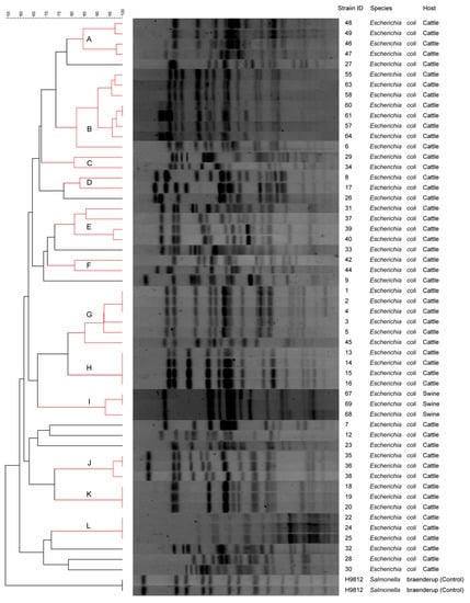 Dendrogram of 54 STEC strains isolated from cattle and swine using PFGE, showing the 12 clusters identified (A to L) in red.