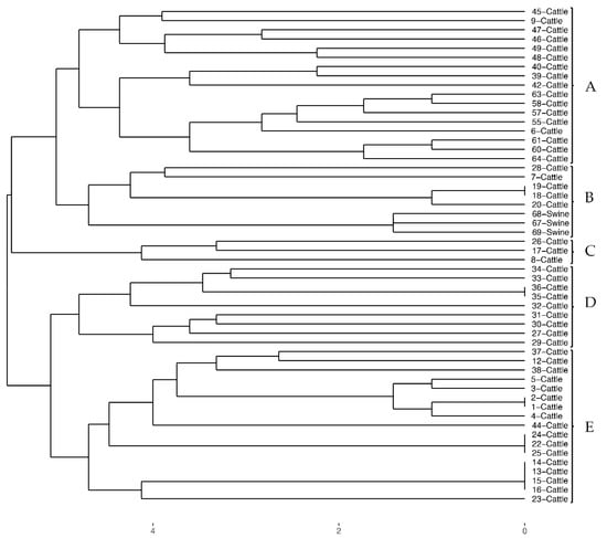 Clustering analysis also showed a high discriminatory power, revealing the presence of five clusters (A to E), where most of the strains were grouped in clades A and E (17 strains each). In this analysis, Simpson’s Diversity Index value was 0.763, supporting the high clonal diversity observed. Additionally, and unlike PFGE, swine strains were grouped together with some cattle strains in this analysis. Thus, even strains isolated from swine that harbored different stx subtypes and virulence genes, obtained through PCR, and showed distinct PFGE restriction patterns, did not have strong enough differences to cause them to differ from strains isolated from cattle.