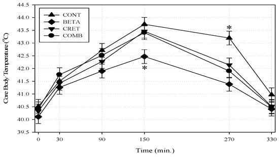 The A–HS bout lasted for 150 min (aver. Ta = 34.45 ± 0.20 °C; RH = 37.60 ± 0.28%), after which thermoneutrality was restored (Ta = 25.77 ± 0.28 °C; RH = 32.28 ± 0.40%). All Tcore values arose significantly (p < 0.01) with time during the first 150 min and declined following the termination of A–HS. A significant (p ≤ 0.05) B by time interaction was observed such that the BETA group exhibited lower Tcore values than all other groups at the peak of A-HS (min. 150; Figure 1). Even 120 min after the A-HS has subsided (at 270 min), the CONT still had higher Tcore than all other groups (B by C by time interaction; p < 0.05).