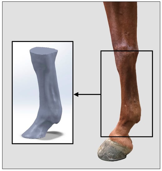 Processed equine distal fore limb mesh (left) relative to equine forelimb anatomy (right). All scans were cropped from the apex of the accessory carpal bone or calcaneus to the dorsal midline of the coronet band.