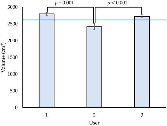 Interoperator scanning differences. Means and standard deviations for measured volumes of an aluminum cylinder from 3 users, compared to actual volume (blue line: 2620 cm3). User 2 volumes (2417 ± 91 cm3) were significantly different than volumes measured by Users 1 (2802 ± 44 cm3) and 3 (2727 ± 45 cm3). Users 1 and 3 were not significantly different and both consistently overestimated volumes (4%–7%).