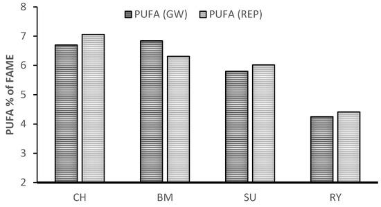 Level of milk polyunsaturated fatty acids (PUFA) of sheep feed with fresh herbage cut at vegetative (GW) and reproductive stage (REP). Annual ryegrass (RY, Lolium rigidum Gaudin), sulla (SU, Hedysarum coronarium L.), burr medic (BM, Medicago polymorpha L.), and a daisy forb (CH, Chrysanthemum coronarium L.) [35].